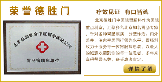 凭借优秀的治疗方法、顶尖的设备、权威的医师、温馨的服务、正规的管理,在国内同行业深受患者好评。北京德胜门中医院消化内科汇聚多名国内知名胃肠医师,本着“专方、专药、专病、专治”的原则,因人因病科学地制定个性化治疗方案,针对性治疗不同症状原因引起的胃肠疾病。》》德胜门在线咨询平台